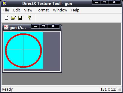 执行新增加的"File - Open onto alpha channel of this texture…“菜单,弹出一个文件打开对话框,选择图2所示的瞄准镜Alpha通道图并打开,DxTex将自动把Alpha通道图的屏蔽信息插入图象中。如下图所示,DxTex默认的淡蓝色背景色表示该像素颜色已为透明色。最后,执行"File - Save"菜单,将同时具有源图信息和Alpha通道信息的图象保存为DDS格式的gun.dds。